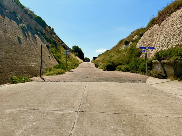 Tucked down behind chalk cliffs is a little sandy beach that has a chalk reef. One side of the bay can be accessed by a cobblestoned slope, and on the other side, a steep flight of stairs. Sea barriers enclose half of the eastern side of the bay in addition to its two isolated sides.